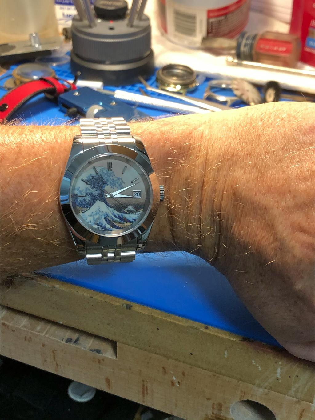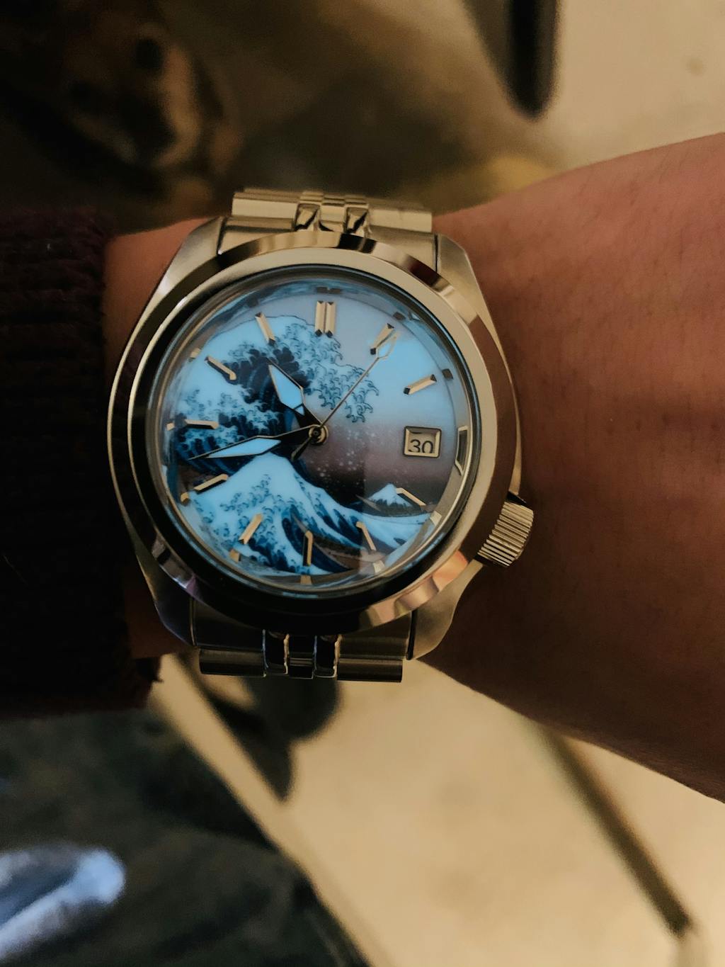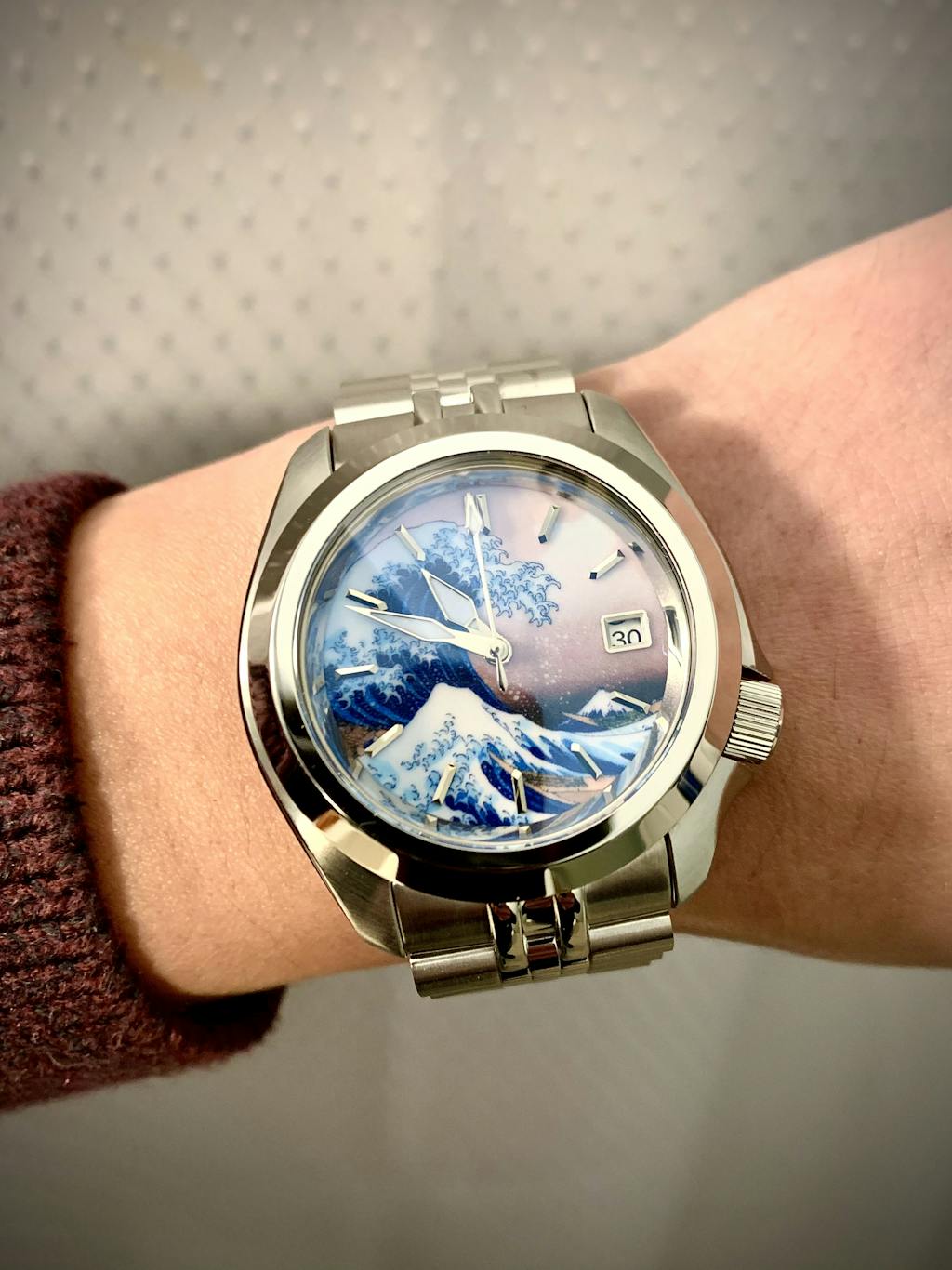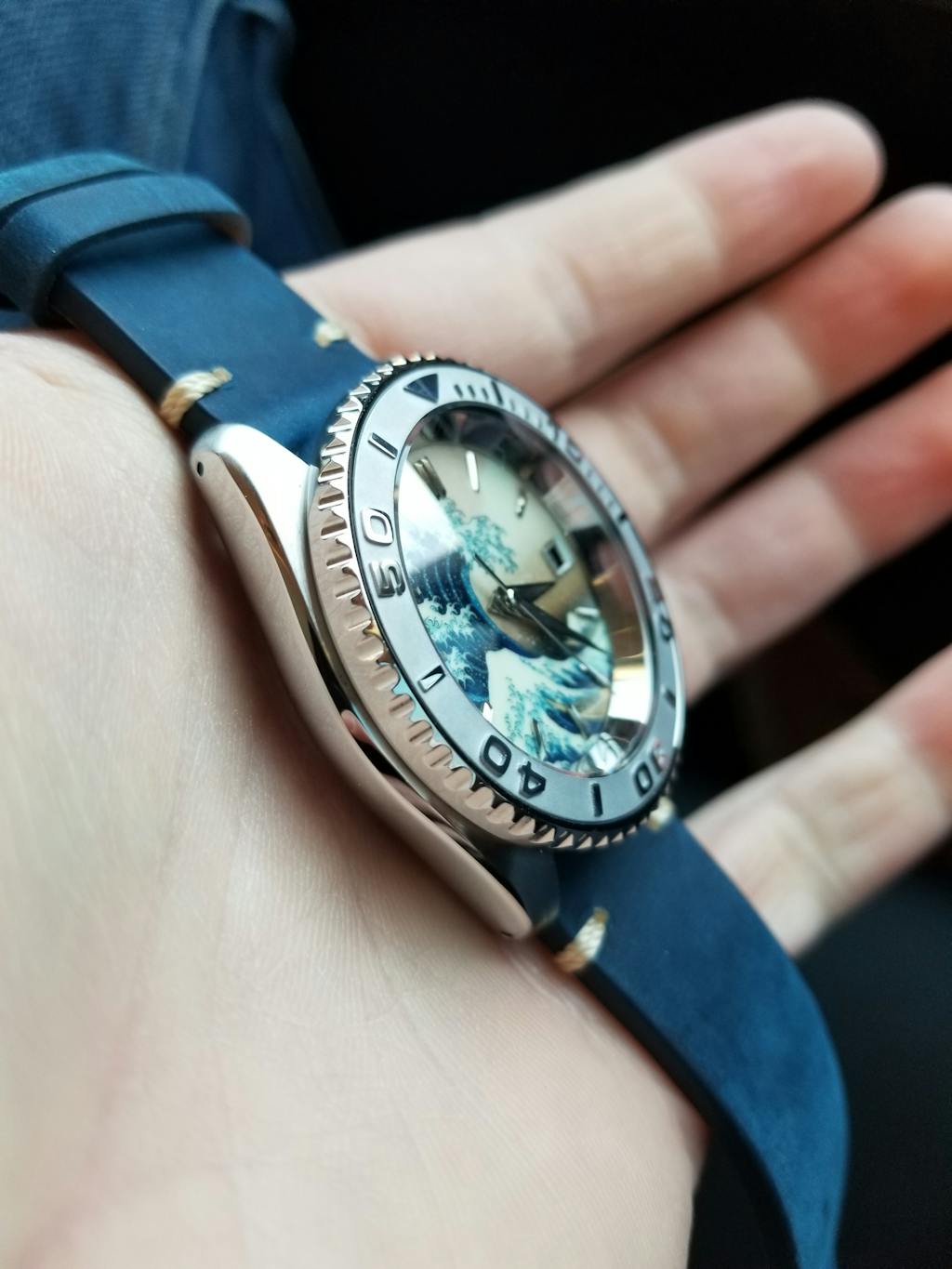 I told myself if I ever modified a watch I would want The Great Wave. I searched online for the best dial and after filtering through less than perfect offerings I found Lucius Ateliers iteration. At first I wasn’t sure how I felt about the orange peel texture, but it’s negligible and is beautiful once the crystal is pressed in. The BGW9 is breathtaking and can’t wait to show it off. I went for a classy theme and continued the Japanese theme by selecting kunai hands. Had the day date option been available I would installed a kanji date wheel. Thank you Lucius for being a part of first modification journey. God bless!