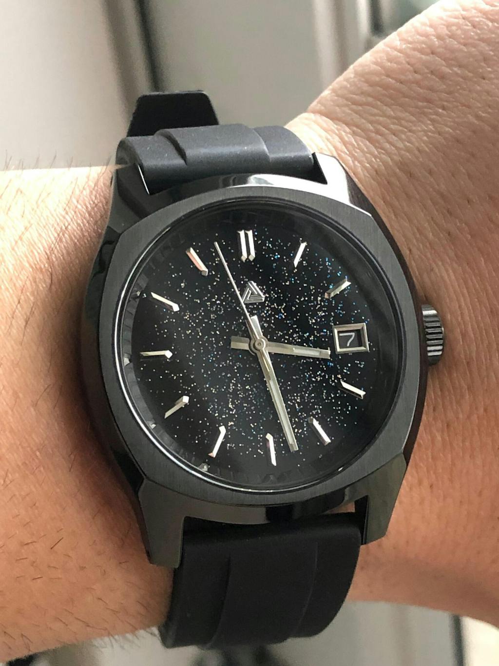 If someone can take the time to hand write a thank you for your support, I can take the time to write a review for a product worthy of it. The dial is hidden lovely in normal light with a sparkle here or there and then erupts when sunlight hits it. This is exactly what I was hoping for. Cased in the NMK932, all blacked out makes this dial the center piece.