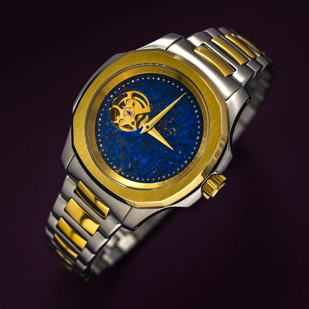 Each lapis lazuli gemstone dial is hand-crafted, hand-cut, hand-sanded and uniquely different. No two pieces are ever the same. Even the minute indices, logo and automatic are individually applied.