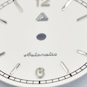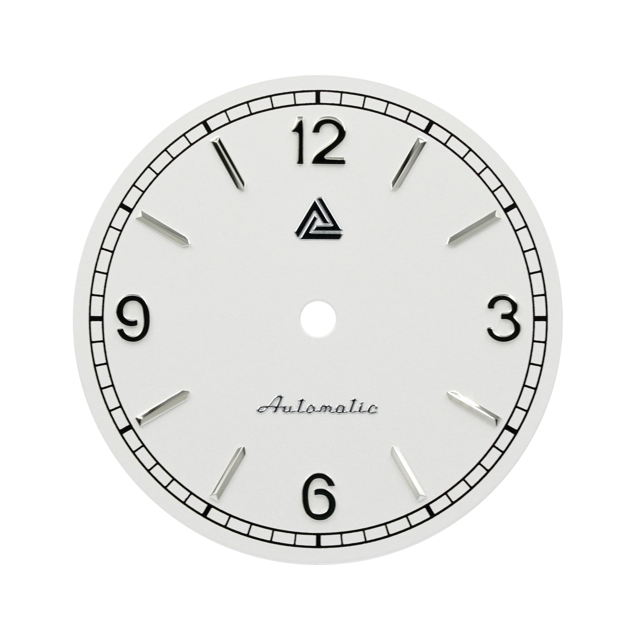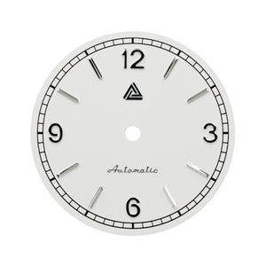 A refined dial that brings timeless elegance to modern builds. Featuring silver-applied indices set against a silvery white matte background, this design exudes clarity and sophistication. A black printed minute track surrounds the applied markers, enhancing legibility while adding a subtle touch of contrast.