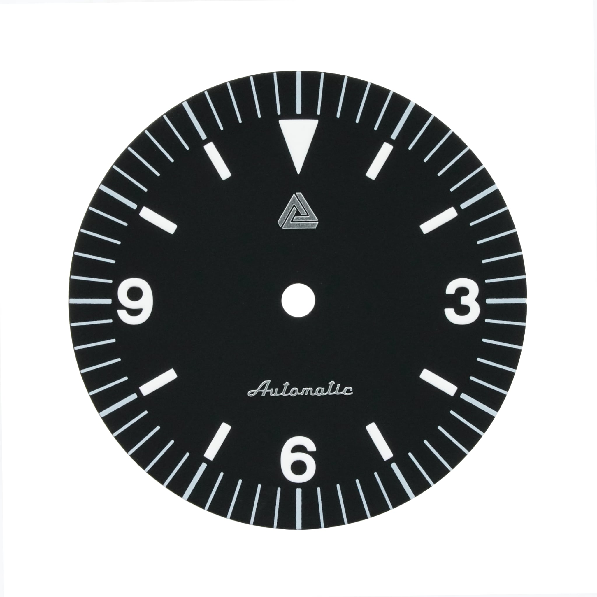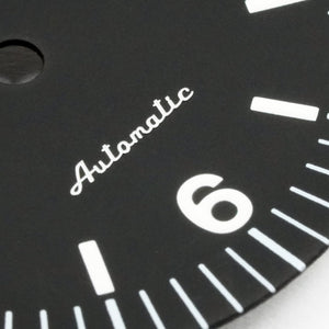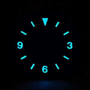 The matte black surface provides excellent contrast and a true tool-watch character. Printed hour indices and numerals are filled with Swiss Super-LumiNova BGW9 A Grade, delivering a crisp ice-blue glow in low-light conditions with strong initial brightness and dependable longevity.