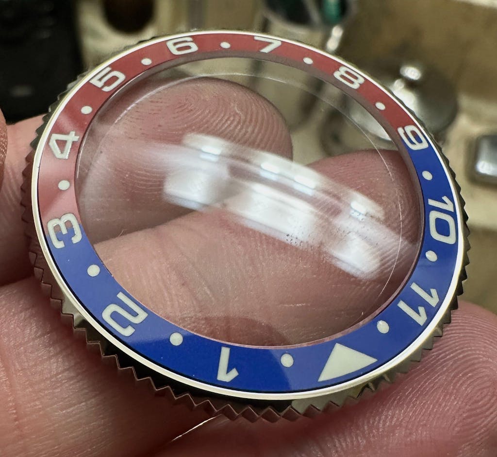 This bezel insert is so awesome, it has that real "Pepsi" feel that we all want, but until recently, Rolex only had. It is on the Lucius Atelier coin edge bezel, and I matched it with a Watch & Style Double Domed crystal for sloped bezels, and look at that fit! I can't recommend it enough!